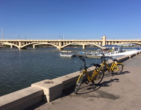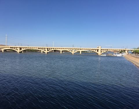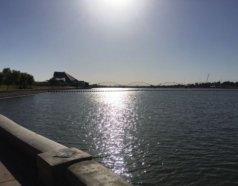 离轻轨车站很近,下来步行10分钟就到了。湖面清澈明亮,岸边停满了船,河中有一艘皮划艇在水面上滑动,天是蓝蓝的,太阳光直晒,真热!