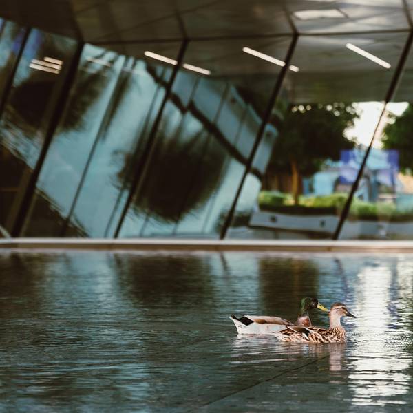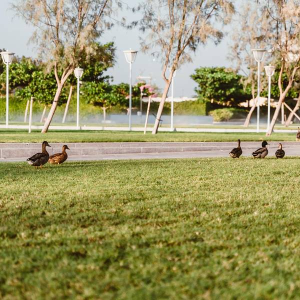 从朱美拉清真寺步行1公里,就能到达阿提哈德博物馆。 阿提哈德博物馆是迪拜最新的文化胜地,占地25000平方米,讲述了联盟成立之初的故事。 博物馆由加拿大建筑师Moriyama和Teshima设计,白色弧形馆顶的设计灵感源自宪法典章的造型。它还配有七根立柱,象征着当年签署条约所用的七支笔。 在这里,你可以探索阿联酋现代史,欣赏历史照片和观看影视资料,阿联酋的历史积淀在这里展露无遗。 博物馆门票25迪拉姆,我是现场购买的。开门时间10:00—20:00。 如果需要用三脚架拍照,也需要提前获得许可。我没有提前做攻略,想拿出三脚架自拍的时候,有工作人员过来制止。我有了古堡市集的经验,就询问去哪里办许可证。但是工作人员说需要提前发邮件申请,建议要用单反拍照的,提前发邮件申请一下会更保险。进门就是大理石阶梯,周围是全景玻璃窗,让阳光可以直射进来,形成独特的光影。阿提哈德博物馆,不仅是一座博物馆,更像是一座艺术馆。内部的装修设计,灯饰都非常好看。馆内还配备一间图书馆、一所教育中心、一处临时展厅以及一家餐厅。来到博物馆外,恍惚间,感觉自己来到了一个生态园。不仅绿植茂盛,更让我惊讶的是,这里有一大群鸭子。傍晚的时候,自动洒水器喷洒在草地上,鸭子们无忧无虑地在草地上散步。整个景区只有我一个游客,我独享了这个美妙的时刻。落日下,博物馆周围的建筑和街道也仿佛发着光。
