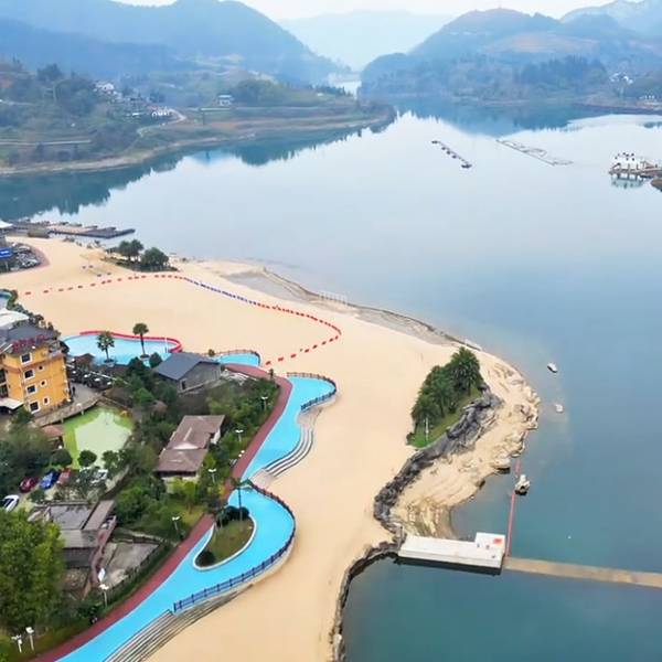 万盛奥陶纪顺路的一个景点,沙滩是全人造的,有沙滩椅子遮阳伞,拍摄角度选好了就可以假装在三亚或者麻袋。不过因为重庆的热天热,就算在树荫下也不像海边那么凉快,沙子确实还可以。