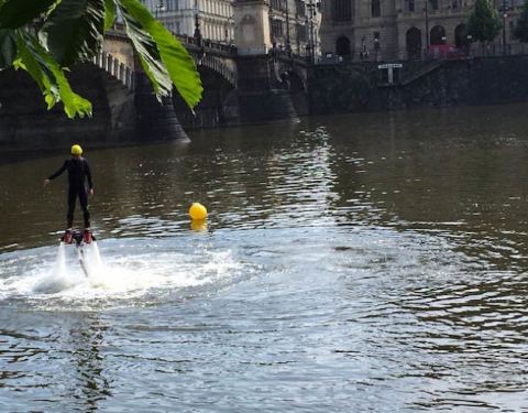 Most Legií大桥横跨水面,非常的壮观!这上面还有很多车通行,不远处是建筑成群,很有生活景象的地方!还能看到当地人在玩水上运动,有趣~