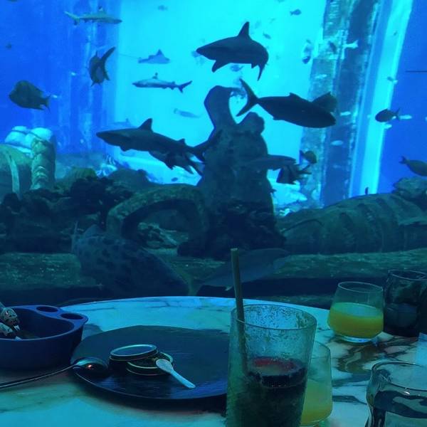 三亚亚特兰蒂斯酒店内的网红海底餐厅,可通过巨大的落地窗欣赏到大使环礁湖的壮观美景。在用餐的同时,有无数的海洋生物在餐桌旁游来游去,整个餐厅笼罩在蓝色的海洋下,美轮美奂,仿佛来到了梦幻王国。