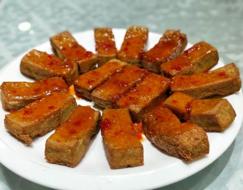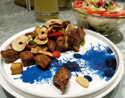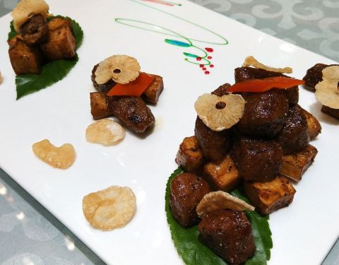 金蒜一口牛:大颗的牛肉粒一大口可以刚刚好,嫩香过瘾,蒜片杏鲍菇是炸过的,这道菜要趁热吃口感一级棒