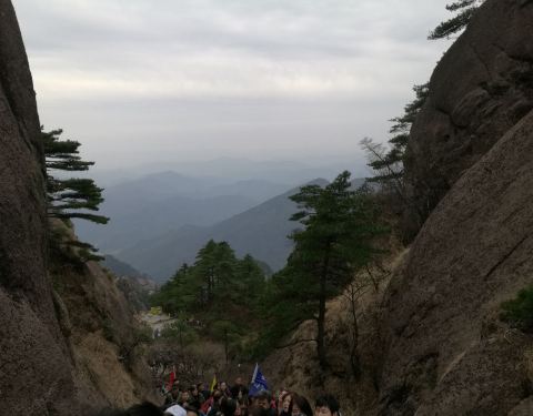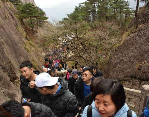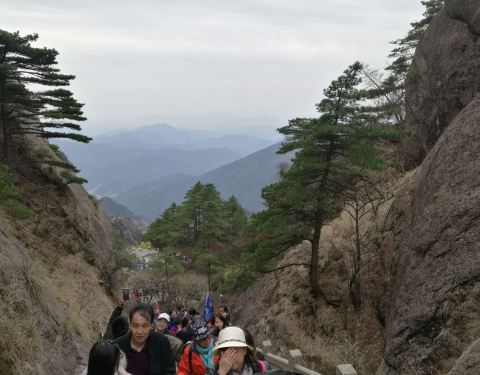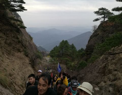 此坡不算长但较陡,爬得人上气不接下气,全身冒着热气,就不觉得寒冷了出玉屏缆车上站,天气虽然转好,但山风劲吹,寒气逼 人。好在从缆车上站到玉屏楼景区去看黄山瑰宝迎客松,要爬个“好汉坡”。此坡不算长但较陡,爬得人上气不接下气,全身冒着热气,就不觉得寒冷了。