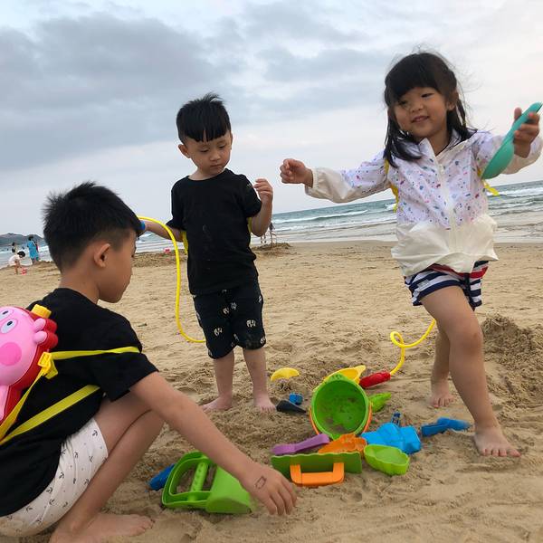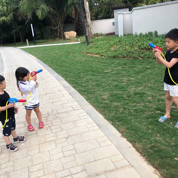 就是三个娃,场面经常会失控🙃吃完午饭回到酒店,给几个娃洗洗澡,睡了个饱饱的午觉~等小朋友们睡醒,已经5点了,天也开始凉了起来,带几个娃到对面艾美的海滩玩~一路走一路打水仗的小朋友们,不亦乐乎~孩子对沙滩真的好无免疫~几个娃一到沙滩,就玩起来了。