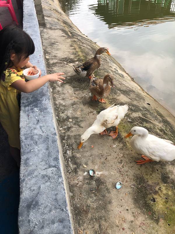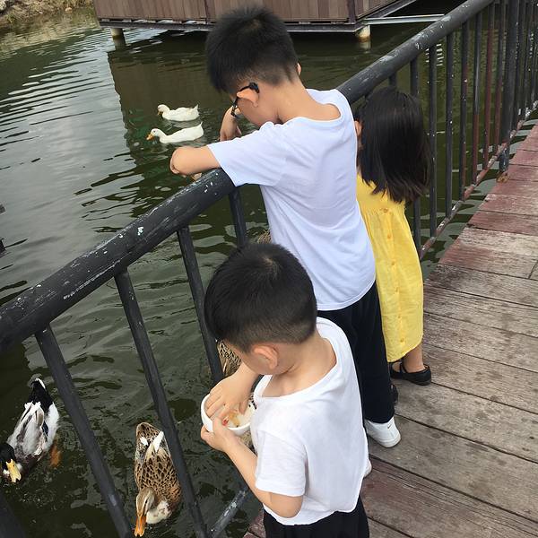 总体来说,还是品质还是不错了~花螺、虾、鱼都很新鲜~旁边的池塘养了一群鸭子,小朋友们吃完饭拿着虾壳去喂鸭子,开心的不得了~