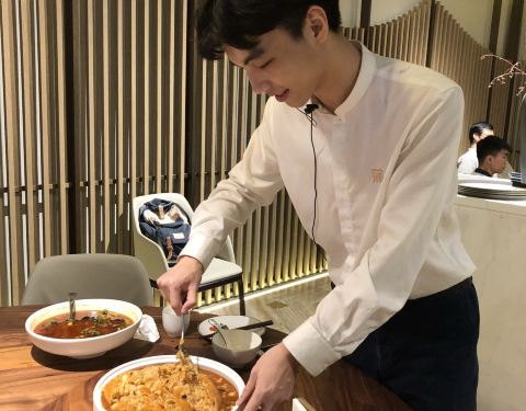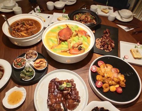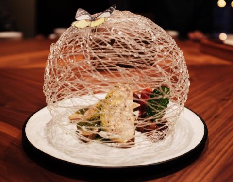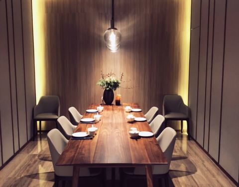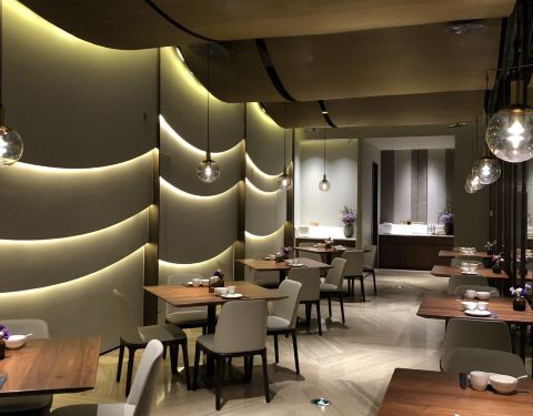 今年新开的美岁城,公交车坐到金融中心站下车就能看到,边上依次是朗豪酒店和万达。大致是因为新开的原因,很多商家还没装修好,虽然是周末,但是商场里还是略显冷清。搭扶梯上三楼很容易就能找到这家店了。出人意料的是,这家店的上座率很高,可以说是基本上满席的状态,和商场形成了有趣的对比。 进门迎宾就会热情的迎上来引领座位并且对餐厅做一个简单的介绍。遇见的每一位服务人员都素质很高,彬彬有礼。 整体装修风格高雅,简约,走的暗色调。很舒服。 做的是精致创意粤菜,所以菜品也是出人意料的可人。 首先端上来的红酒鹅肝佐干提薄荷酱就让人眼前一亮,拔丝的麦芽糖缠绕出一个小圆圈,罩着鹅肝。上面装饰着可食用的蝴蝶糖纸、鹅肝入口微凉,配着薄荷酱,非常特殊的体验。很喜欢。 广式爽口四位,好像这家店很喜欢用薄荷酱哦,薄荷酱配牛肉,吃过得都说好,哪怕是萝卜干和花生米调味也是非常棒了。 港式波龙焗伊面,很喜欢的一道菜,面条很爽滑,慢慢的吸收了焗波龙的汤汁,逐渐变得有味。即使放久了也不会软踏踏的失去口感,我真的是一个人光面条就吃了3碗了吧,波龙的味道就更好了,肉质紧实Q弹,能够感受的到食材的鲜美,强烈推荐这道菜。 黑猪肉芒果烧,非常有层次感的一道菜,最上层覆盖的是奶香浓郁的芝士,然后芒果,接着是黑猪肉。个人感觉十分有创意。摆盘也是精致美好。 黑蒜螺头炖排骨,黑蒜汤一直很喜欢喝,他们家的不油腻,汤汁清亮确回味无穷,很喜欢。 芝士焗薄荷肋眼皇,非常非常有味道的菜,调味很好,而且芝士与薄荷酱的搭配真的很奇妙啊。 太阳果辣味焖饭,超级可爱的一道菜哦,或者说算是主食呢?可爱的小南瓜挖空,装上焖饭,把甜甜的南瓜挖下来拌着米饭吃,光是这样吃,就已经觉得又有趣又满足了~