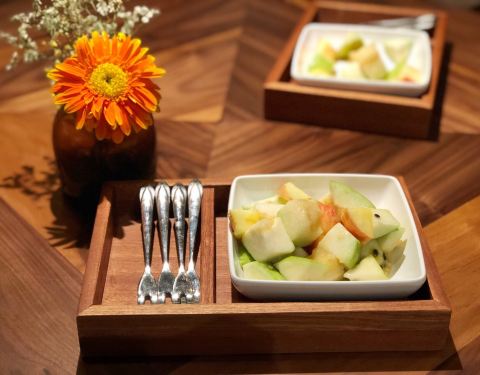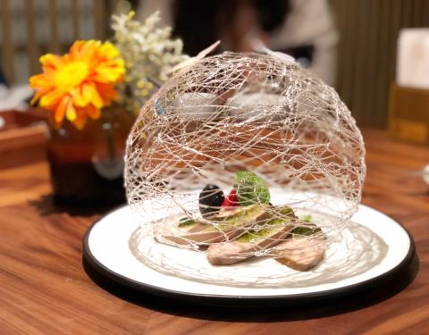 特别是里面的爽口萝卜,脆甜的口感忍不住又上了一盘。 餐前水果 红酒鹅肝佐干提薄荷酱,外形惊艳了我
