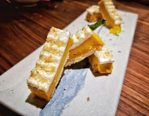 蒲舍——经典粤菜选择 蒲舍位于仙岳路上湖里万达旁边新开的美岁城3楼,商场虽然还没全开,但是餐厅的人气倒是挺足的,用餐时候已经有不少人了。整个餐厅的装饰走的是原木的色调。高雅舒适的环境给人一种静谧的美感。 餐前水果 红酒鹅肝佐干提薄荷酱,外形惊艳了我!镂空圆罩一只蝴蝶停在上方,害怕大声惊呼会惊走它。打开盖子,里面的鹅肝软嫩可口入口即化。搭配上特制的薄荷酱吃起来一点都不腻。 整个餐厅的装饰走的是原木的色调。高雅舒适的环境给人一种静谧的美感。 餐前水果 红酒鹅肝佐干提薄荷酱,外形惊艳了我!镂空圆罩一只蝴蝶停在上方,害怕大声惊呼会惊走它。打开盖子,里面的鹅肝软嫩可口入口即化。搭配上特制的薄荷酱吃起来一点都不腻。 茉莉菊花豆腐灼海蚌,如果前一道菜是摆盘惊艳了我,那么这道菜是刀工惊艳了我!极致的刀工刻画出绝美的豆腐“菊花”,再加上海蚌的鲜甜、茉莉的清香,粤菜的精致可见一斑。 广式爽口四味,仙气袅袅的登场。特别是里面的爽口萝卜,脆甜的口感忍不住又上了一盘。 相对于清爽的小菜,也有川式麻辣三件,麻辣口味腾椒香气浓郁。 咖喱时蔬焗膏蟹,面包的外壳,盛放着切成块的膏蟹。咖喱蟹的做法很常见,不过里头加入了水果,使得咖喱中又带着水果的香气,口感更丰富。