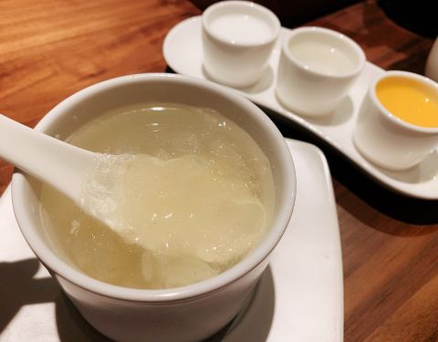 亲爱的提前预定了位置,然后我们提前到了,嘻嘻。 这个商场里意外的静悄悄,都有点不太像过节了呐。 不过餐厅里客人还是挺多得就是。 这家店内部的环境还不错看,两人用餐还蛮舒适。 菜品还可以,尤其喜欢「鲜松露兰杜爆澳带虾球」,虾肉是平淡中又带着美味,芥蓝菜这样弄还蛮好看。 「黑猪肉芒果烧」味道还可以,只是不太喜欢芥末。 「养颜雪燕」跟菜单相比差距太大了,差评。不过味道还行。