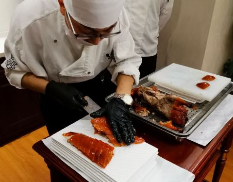笑立居饭店开了也有一两年了,他家饭店还是档次可以的,糟货双拼,白灼草虾较大,点了一个招牌菜——笑鸭套餐,每次都是厨师把整鸭推到房间里来进行片片和分盘,味道不错,不比北京的差。马桥香干烧鲍鱼有新意,炭烤松露小牛肉偏甜,清蒸笋壳鱼蒸过了,味道一般。笑立居的老板也是上海有名的大厨,吃个饭就是要与众不同,虽然价格不便宜。