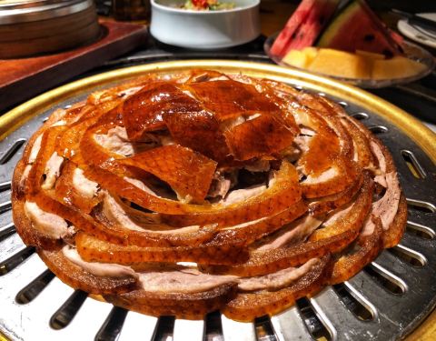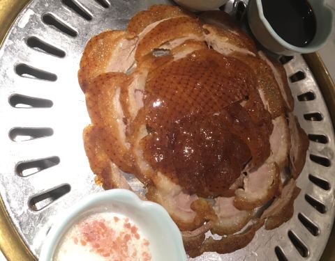 最近很火的一家新开不是很久的烤鸭店,在不少平台做活动和广告,主打概念就是京藉。 长假期间约在此小聚并不明智,出行人多拥挤不堪。在第一百货四楼旁边也是很火的一家火锅店,门口有点乱哄哄的感觉。 环境还可以,特意做了些木质隔断,鸟笼窗纱水墨,用的器具也有些讲究,颇有八旗之风?! 味道,无功无过。比老资格贵族血统又不思进取日渐没落的某烤鸭是不相上下的。鸭架煮汤变成了火锅,这个也不错,多了些接地气的选择。风味超时送红糖糍粑,为啥不是送驴打滚呐,哈哈,看上去会更京腔京调吧。