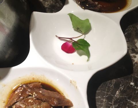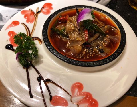前菜推荐:烧椒鹅肠,特别入味,爽脆,跟鸭肉包在一起吃也很好吃。终于吃上传说中的 烤鸭火锅了~推荐