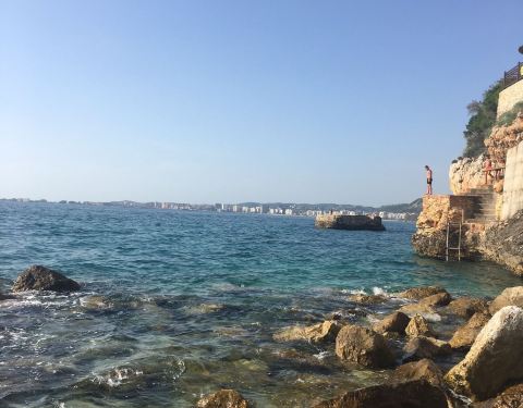 这里是阿尔巴尼亚最美的海滩,这里的海水有着深邃的蓝色,层次分明。而且岸边的礁石正好成了天然的跳水台,吸引着许多喜欢跳水的年轻人来这里享受跳水的乐趣。这里的沙滩是石子地,需要穿鞋踏海,否则脚很疼,也容易被划破,要千万注意。