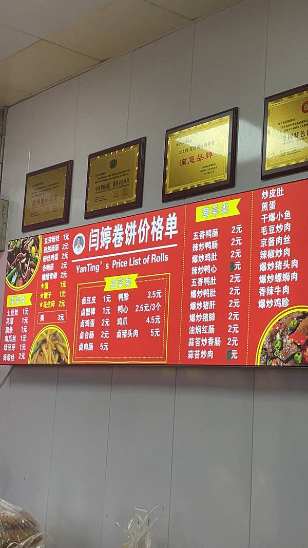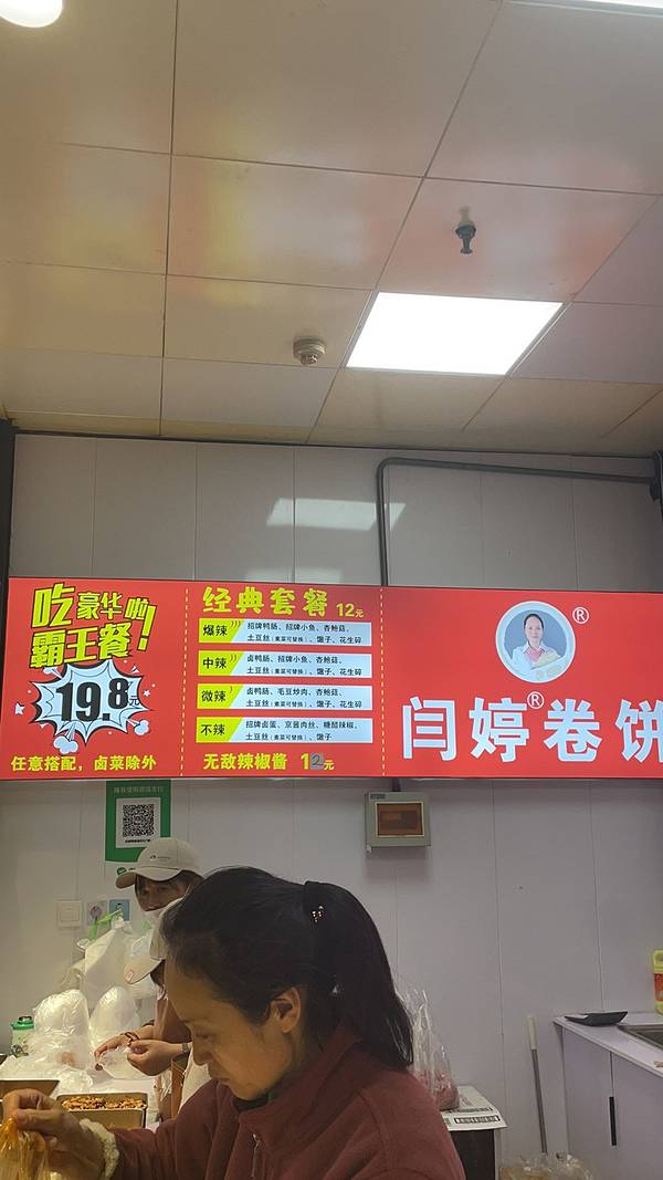 五一假期特意辗转大汉古都徐州,来了必须打卡徐州美食,去徐博乘地铁的路上无意间看到地铁站海报窗口的宣传~闫婷卷饼,本来对这种美食很感兴趣,爱吃的哟,必然不可放过,搜索发现竟然还有很多分店,由于时间关系要赶路,导航最近的店铺也许来不及去了,不甘心的回到1818附近的金地酒店,然后想想还是买点其他吃的吧,没想到真没想的刚进1818入口就看到一家闫婷卷饼店铺,但是导航上没标识,也许是新开的还没来的及吧,吃的人挺多,略微排队一小会就轮到了,看了招牌价格,时间关系选了12元的霸王套餐,好多菜啊,包装带走路上可以享用了,结果名不虚传,我喜欢微辣的,面皮好劲道,包的菜品种多,味道超级棒,辣度正合胃口,吃的太爽了,真不虚此行,好喜欢吃这个地道美食,感觉比阜阳的田三卷膜还好吃,真是舌尖上的中国,地大物博,美食无处不在