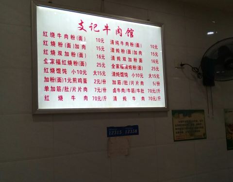 在安顺大名鼎鼎的支记牛肉粉,在市内有多家分店,家运天成的这家直营店的味道和总店几乎没有差别。 周末上午9点到店,可能小区的人都还在享受周末的懒觉时光,进店人不多,但听口音几乎都是本地人来吃。虽然价格12元,比其他家的牛肉粉价格高个1-2块,但是其他家牛肉粉店的碗内牛肉大小和他家相比,完全不可同日而语,该店的牛肉块明显大很多,所以12元的价格是值得的。要了一份小碗的红烧牛肉粉(个人认为,他家最好吃的是红烧的汤底)。端上来看到红彤彤的汤底,碗面铺了一层红油。粉是干粉泡制过的,也是当地的特色,挺有嚼劲。照例先喝汤,汤料味道较重,味道浓厚,红烧的卤味十足。牛肉大块,肥瘦相间,一口咬下去,在口中满满咀嚼,方能感受到卤汁的浓郁香味。 有免费的泡芹菜末和青椒提供,泡的时间稍久了,味道过酸。
