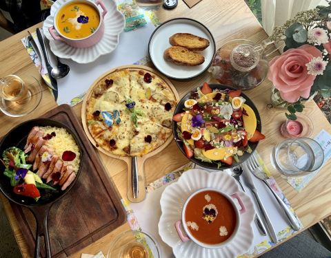 小伙伴辛勤耕耘中的体验餐,对于蹭饭我是很热爱的[耶] 餐厅的外表不是很显眼,由苏子花艺和苏子花厨两个区域,被鲜花包围的用餐环境十分浪漫,适合小情侣约会,晚上的氛围应该更好。 「有机蔬菜浓汤/南瓜、杂菌、番茄」「仙女沙拉」「味增慢烤猪颈肉」「麻辣熏肠薄脆披萨」「玫瑰酸奶芝士蛋糕」每道菜上面都有鲜花,是恋爱的色彩[机智] 「仙女沙拉」用醋拌的沙拉,水果很多,而且吃醋的仙女不怕长胖。 「有机蔬菜浓汤/南瓜、杂菌、番茄」南瓜浓汤要比番茄好喝。 「麻辣熏肠薄脆披萨」麻辣香肠真的很像贵州的腊肠,同芝士一起味道怪怪的,我不是很喜欢。 「味增慢烤猪颈肉」很爽脆的猪肉,做成条蘸酱吃。 「酸奶芝士鲜花蛋糕」上面是酸奶玫瑰蛋糕,底部是奥利奥饼干层,好吃。