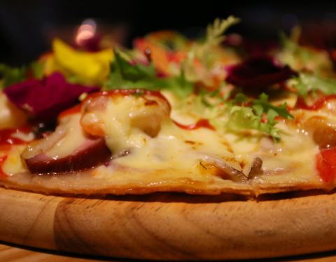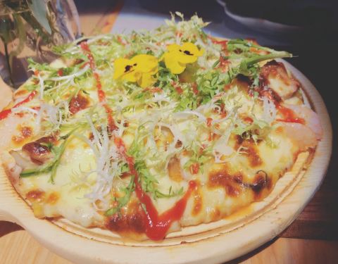 在珠江新城名门大厦上班的朋友中午约饭,选了楼下的苏子·花艺西厨。这家西餐厅位于花城大道2号名门大厦首层,在地铁五羊邨站B出口对面,五羊新城行人天桥的桥脚,地理位置不错,交通方便。 这家既是西餐厅,又是插花店,可以满足人们的多种需求。餐厅装修得像花之海,是珠江新城CBD中的世外桃源。 中午的顾客不少,有三五同事或朋友小聚;或情人利用中午抓紧时间谈情说爱;甚至还有举办PARTY。 香煎牛板筋 煎得正好,七成熟,肉质鲜嫩,略带点粉红色。不放任何酱汁,撒点盐更加原汁原味。 水果沙拉 有橙子、芒果、火龙果、甜玉米等,清爽健康。 熏肠薄脆披萨 披萨底很薄,很酥脆,带有辣味的熏肠味道很特别。 服务员小哥哥、小姐姐态度超好,服务细心周到。