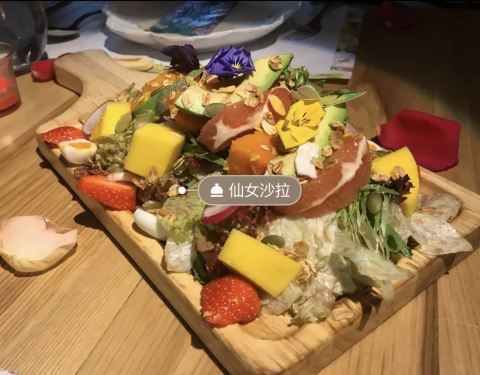 这一家餐厅位于花城大道与广州大道交汇处的名门大厦首层,我公司离这里不远,经常都会搜一下公司附近的餐厅,其实也早就听说过这一家网红店,见到别人的照片那么漂亮,心里面早已经有一种想要去吃吃的冲动了。有...这一家餐厅位于花城大道与广州大道交汇处的名门大厦首层,我公司离这里不远,经常都会搜一下公司附近的餐厅,其实也早就听说过这一家网红店,见到别人的照片那么漂亮,心里面早已经有一种想要去吃吃的冲动了。有同事约下班聚一聚,我马上就想起了她。餐厅其实很好找,就在名门大厦几个大字的下面,由于是工作日的晚上过来的,而且下班早,来到的时候餐厅还不是很多客人,可以到处看看花艺,原来餐厅里面的鲜花布置都是使用真花的,一下子感觉自己到了一个花海博物馆。 【仙女沙拉】 我开始是被名字所吸引的,吃了会变成仙女吗?当然不会,但是这道菜非常惊艳,懂我的人都会知道,我是非常喜欢装饰得很美很美的菜品,就算是那种大盘子、小食物,靠着七彩小花、绿叶扶持的菜品,我也会觉得满足了视觉的效果,更何况这个沙拉,除了漂亮以外,分量也非常多,同时也是一道很营养的菜,蔬菜配水果,还有藜麦、果仁,大爱! 【什锦莎莎】 这是一道小吃,一份有四件,芒果、牛油果、草莓和蔬菜,都分别在水果的下面垫了一片薯片,最上面挤了一些黄芥末酱,旁边的小花、“小蝴蝶”简直漂亮得秒杀了不少的照片。我一直在拍着照,换着不同的角度,就连同事也都惊呼太美了。 【德国黑啤鸡】 这道菜也很好吃,但是我不知道为什么叫这个名字,是用了黑啤去做吗?反而我吃到的是盐焗鸡的味道,不是很浓,但是用的是新鲜鸡,盐焗的火候也掌握得很好,鸡肉很嫩。