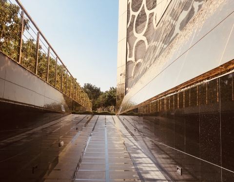 迪拜之框建于2013年,高度约150米,宽93米。其建筑外表全部贴金,总造价高达3亿人民币,土豪的世界不敢想象,真的非常奢侈。走近看金相框的细节,金光闪闪,十分亮眼。摸一下墙面,瞬间感觉自己富有了。这么酷炫的黄金相框,还可以上去,从外形上看就可以知道,里面的内部空间并不是很大。相框的底层是一座小型的历史博物馆,它展现了迪拜的历史文化。站在上面,可以看到迪拜得新城区和老城区。