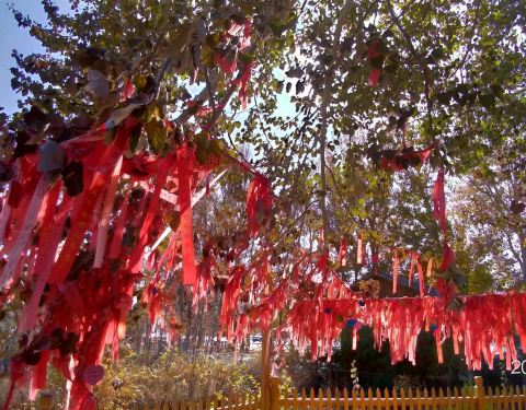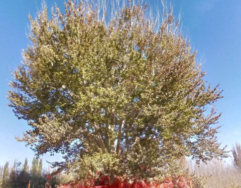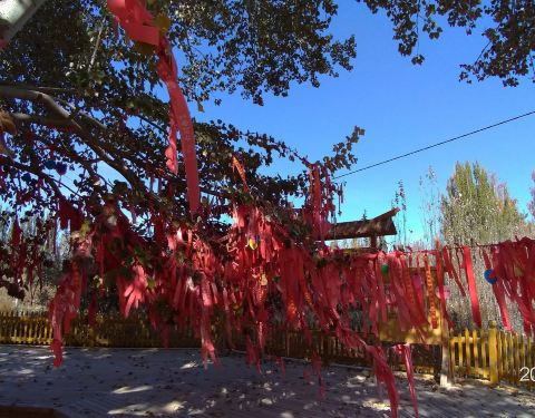 千手观音杨是在景区里倒数第二个景点,观音杨,其实最后几个景点相距的距离也不是很远,可以慢慢步行过去不坐电瓶车,这样更能欣赏沿途的风光。在这美丽的胡杨林中,有一颗挂满了红色丝带,寄托了大家的愿望的千手观音杨就在景区里。它的树干如同千手观音一样往外延伸。吸引众多游客来观赏。