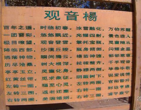 【千手观音杨】 在金塔胡杨林,一棵高大、枝叶茂盛的杨树,生长在荒漠戈壁上,一个美丽、神奇的传说……,人们把它命名“千手观音杨”,每逢初一、十五,当地的善男信女都来这里祈福,据说在此树下许愿,...
