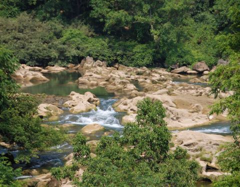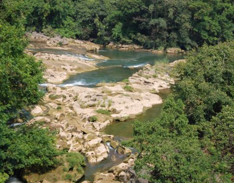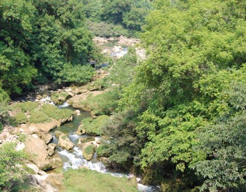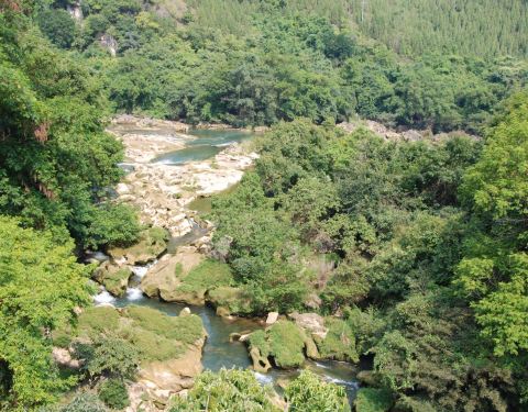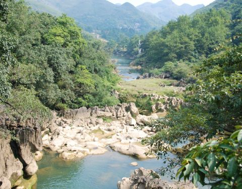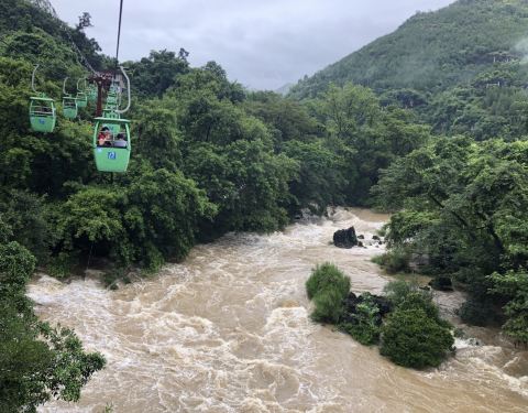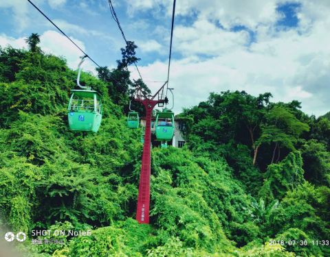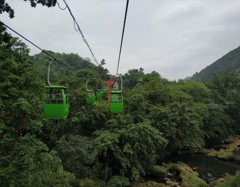 天星桥景区的末尾。 游览结束之后,可以步行出景区,也可以坐缆车出去。建议坐缆车,一方面价格不贵,一方面,走了很久也比较累了,坐缆车可以休息一下,还可以在高空看风景。这一段风景还不错,可以看一下下面的溪流、怪石和树丛。