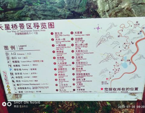 天星桥景区的末尾。 游览结束之后,可以步行出景区,也可以坐缆车出去。建议坐缆车,一方面价格不贵,一方面,走了很久也比较累了,坐缆车可以休息一下,还可以在高空看风景。这一段风景还不错,可以看一下下面的...