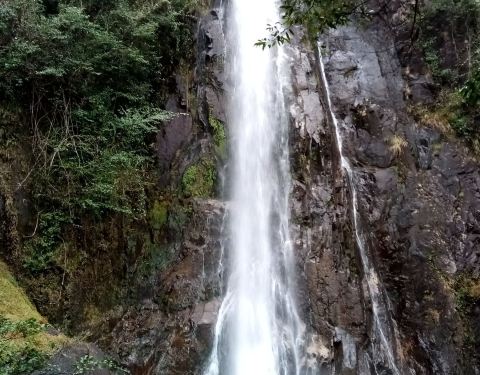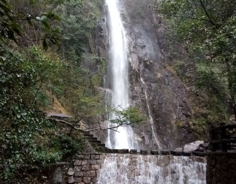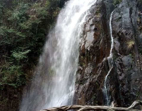 姑婆山里坐观光车,第一站就是仙姑瀑布。离景区门口约五公里,车行十分钟。下山后再走二十分钟左右就到了。瀑布高30多米,宽5米多,是景区里的有名景点之一。