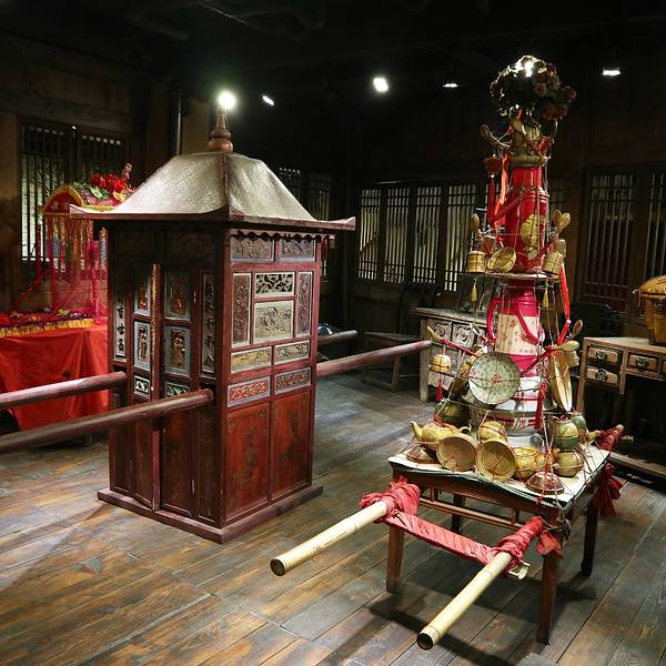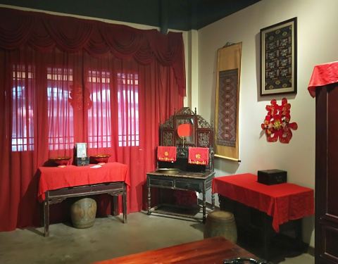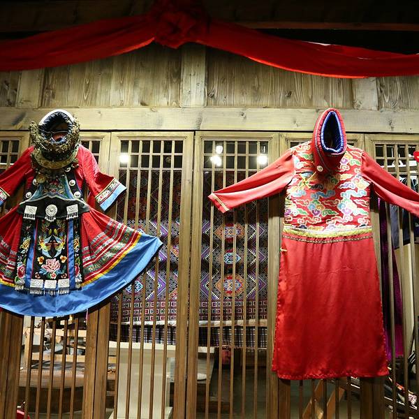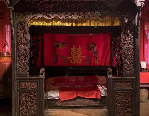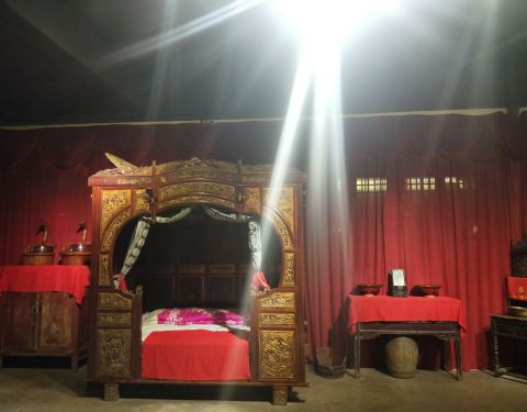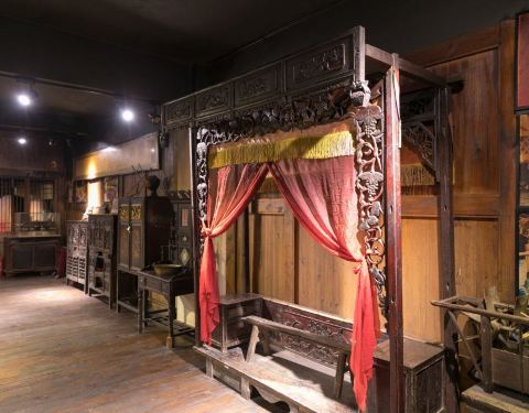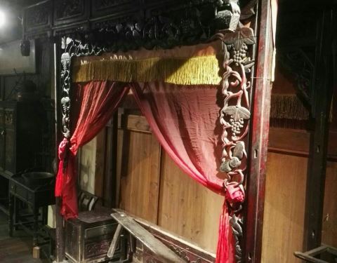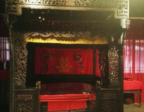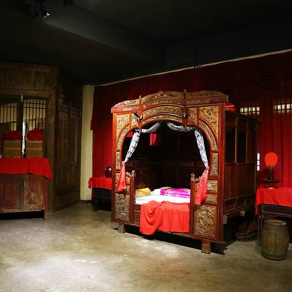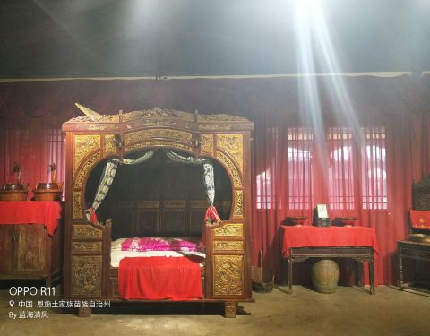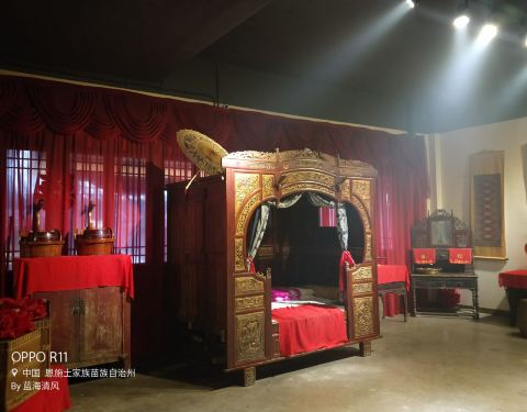 女儿城土家民俗博物馆:土家族婚房及家俱展示女儿城土家民俗博物馆:土家族婚房及家俱展示。土家族的婚房布置,与汉族有相似之处,婚房内要贴“喜”字,床上用品以红色为主色调,床架上有各种雕刻等。