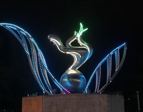 【景色】昭平河东江滨公园,公园内有一个标志性建筑,茶叶的嫩芽,晚上装饰得还不错,桂江两岸风景优美,像一幅幅美丽的风景画卷。