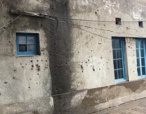 今天去的,可能下雨原因,没人开门,只得在外面拍了几张图片,墙上弹孔清晰可见,不知道是不是从里面能抠出来彈头?总体感觉这地方阴气太重,荒凉,不适合孩子过来玩
