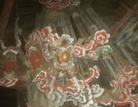 悬空寺上一个庙宇,结构有些小,早知道能在这里盖个庙可不像平原上。非常费劲,所以虽然很小。我们看的也很仔细。里面供奉好像是……雷震子