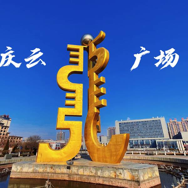 庆云广场中部的主雕塑——“龙鼎盛世”高28米,以篆体“龙”字为造型基础,大气恢弘、气势磅礴,打破了“龙”字的世界纪录。三条金龙相互依靠鼎力向上,寓意我们是龙的传人,传承的是龙的文化,开拓的是龙的精神;金色与“龙”字的完美组合,象征着富贵、吉祥,印证了“五福齐临地,吉祥庆云城”的说法;雕塑顶部的银珠,既是“龙”字的笔画,又象征着庆云是齐鲁大地一颗明珠。雕塑又似三把金钥匙,寓意着庆云人开启未来之门。