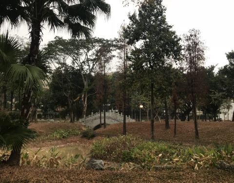 平康公园位于番禺区平康路与番禺大道交叉口西北侧(平康路赴京),距离地铁三号线总站番禺广场站不远,交通方便。 经过平康路,无意之中发现了这个小公园。这是一个固定应急场所,全开放式,面积不算非常大。有凉亭、小桥和人工小溪,有点小桥流水的韵味。绿化做到不错,现在的时节,满地是金黄的落叶,非常漂亮。不过公园里的游人非常少。