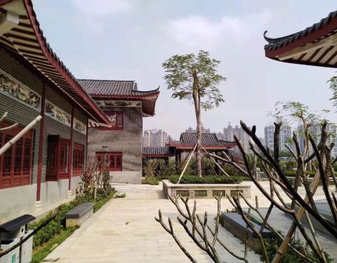 公园在江边,风景秀丽,中式园林建筑点缀于河岸边,花草树木增辉,斜阳下,冬日风大,附近有公交站,对岸有城市综合体。逛一逛要得。
