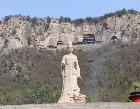 ...登上中皇山,首先映入眼帘的是一尊美丽的女娲石像,她的身后是挺拔的山峦和镶嵌建造在半山腰的娲皇宫