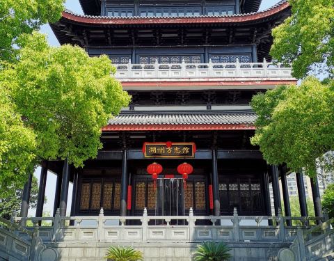 在湖州城北水闸和项王公园奉胜楼之间有座仿古的楼阁,是湖州方志馆。应该是编修湖州地方志的场所。位置很好,紧靠笤溪河,周围草地和绿树环绕。