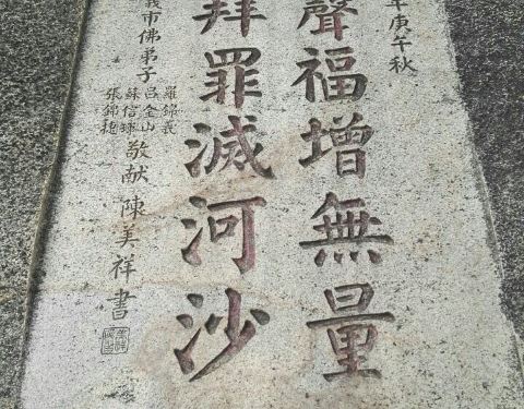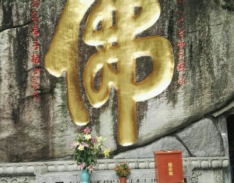 佛字岩位于南普陀寺內,藏经阁后身的一块岩石,上刻鎏金佛字,寺內著名景点,游人多拍照留影,周边石...