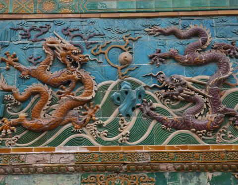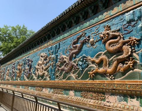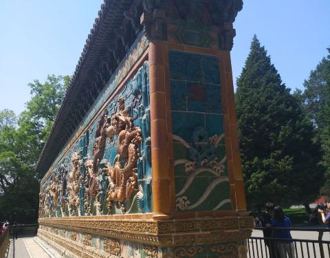 北京有二处九龙壁, 一在故宫皇极门前, 二位于北海公园五龙亭以北,天王殿西侧