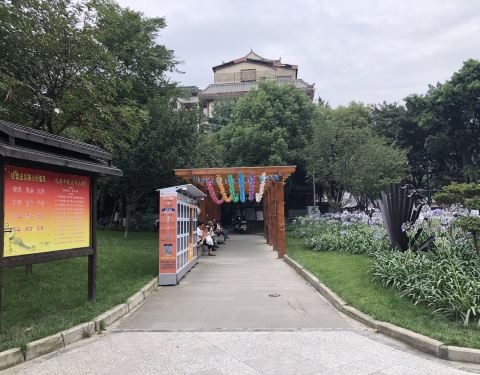 免费的,不用花什么钱,可以作为一个休息的地方,旁边有两只熊猫模型,绿色的,有点奇怪,还有个图书借阅自动装置,可以借阅图书借阅,有个长廊,可供休息