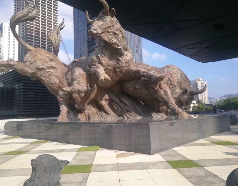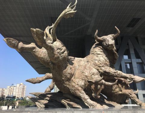 我是来替大家看看牛市还会不会来的,这里周边环境还不错,但是交易所广场上的这头牛也太恐怖了吧,所以我们的牛市都是疯牛市吧。