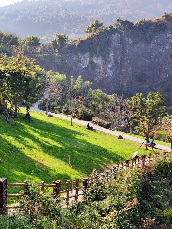 因宝蓝色的水被誉为重庆的”小九寨“,正在打造中的渝北区铜锣山的矿山公园,曾经是废弃的采石场,预计今年5月矿山公园将改造完毕对外开放。现在去,车要停在外面,步行进入施工现场,感受部分绝壁下湛蓝水池的小美好。 铜锣山,曾是重庆渝北最大的石灰岩矿区,数年开采留下40余个矿坑。2010年,渝北区关停铜锣山石灰岩矿区,矿坑形成好多个深邃而斑斓的“湖泊”。据官方说最美最大的是11号坑,我来到的就是11号坑。每个坑的颜色都不太一样,有的很蓝,有的是翡翠绿,还有渐变色。 地址:渝北区石船镇石壁村 自驾:直接导航渝北矿山公园11号坑即可直达 公交车:坐3号线到高堡湖,在空港枢纽站换乘838公交,再换成988到石壁新村下车(全程3小时,大家还是自驾吧。。。)