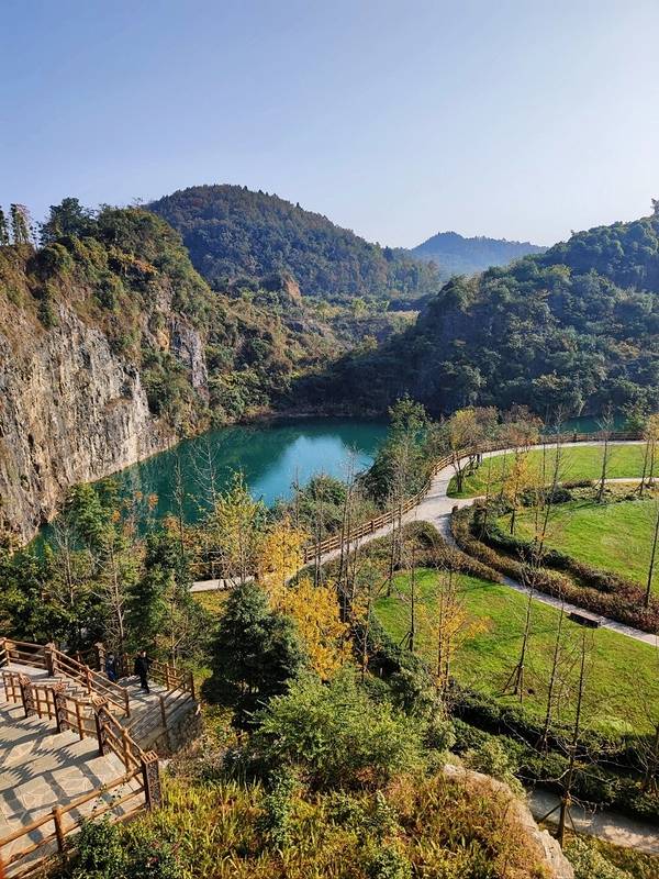 2015年偶然从新闻上看到的,据介绍,整个矿山公园有41个较大的废弃矿坑,沿玉峰山、石船、古路三镇一字排开,其中39个矿坑分布在石船镇。蓄满水后,废弃矿坑成为坑塘湖,由于矿坑积水长期对岩石的溶解作用,水的颜色渐渐变成了翡翠色,颇为壮观,听说现在已经是网红了,被称为“都市的黄龙”、“重庆的九寨”。