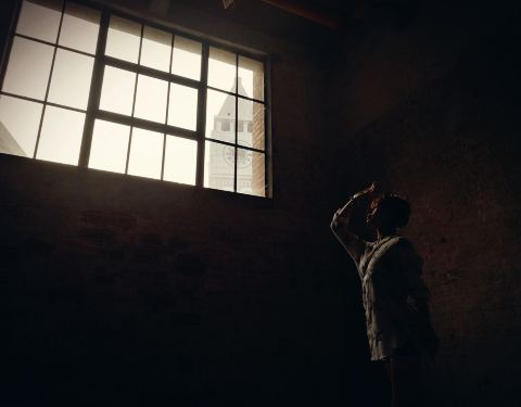 利用窗户透出的光,人物站在窗户下,抬起头,可以拍出很强烈的明暗关系对比,光影效果特别强烈!