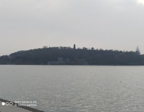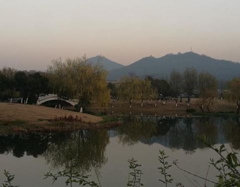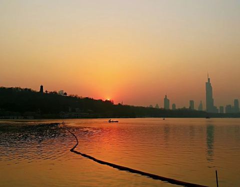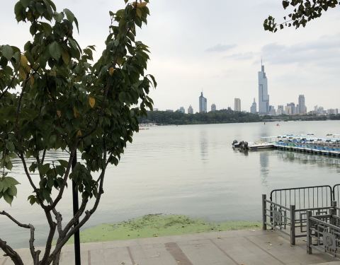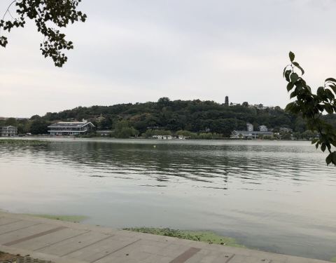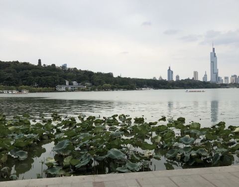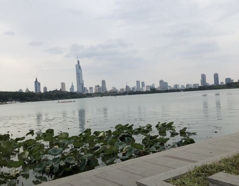 ...岸风景,一边是湖光山色,远处是南京最高的紫峰大厦,夕照鸡鸣寺,一边是情侣园的郁郁葱葱,森林茂密