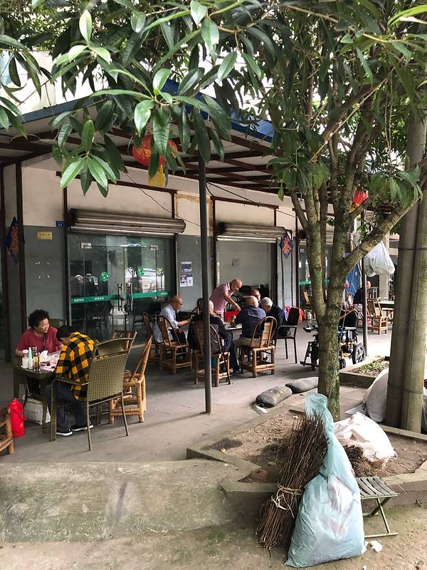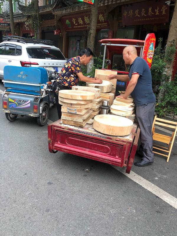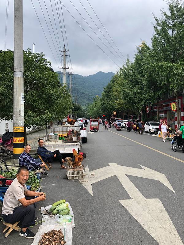 劳顿的一天,换取一夜安眠;山脚下的夜色像是平常村落般,零星的闲聊人群,被习惯早睡日落而息的人早早关掉的灯火,可能是从山间吹来的微风,伴着因山泉蒸发而得的水汽,四周不绝于耳的蝉叫和蛙鸣,致使山脚的夜那么静谧,悠然田园;没有车鸣和喧嚣,却又静得充满生机,有着瞬间让人气定神闲的魔力。起床不算很早,吃了早餐,走出院子的街上就是市集,各色花卉和各种农副产品都一应俱全,虽已将近10点,但还是很热闹,一行行拉着购物小车的老年人穿行其间,操着各地方言,购买着心仪的产品。或许在别处兔子会当宠物贩卖,但是在成都它们却是餐桌上的佳肴;没有一只兔子能活着出成都,兔兔那么可爱,当然要吃掉它了。已经好久没有见过这种菜板了,纯原木打造,天然无任何化学成分添加,守护家人的安心之选。路边尽是茶室,拄着拐杖的人们可能吃过早饭就在这里聊天喝茶到午饭时间,我猜想他们讨论的话题可能会从哪家小商贩的菜更新鲜一直到最新的国际政策;这里的确适合养老,气候宜人,风景秀美,物价亲民,猜想可能这里也是当地知名的长寿地,从街上往来的人群看,期间有很多应该已经年过90了,身体却依旧硬朗。看到路边有卖当地脆李的,于是买了一斤以供路上食用,果肉紧实,咬起来清脆,口感香甜,核子很小,甜酸配比度刚刚好。洗好后放在保鲜盒中,当时还觉得买多了,拿着重,吃起来却十分上瘾,完全没有吃够,别具特色的休闲零食。