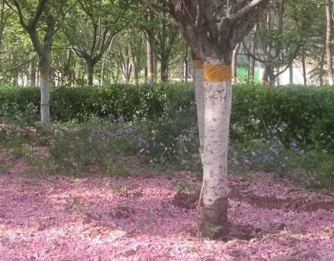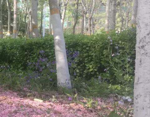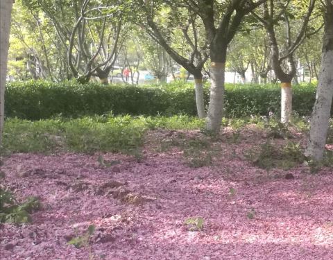绿化面积很大,初春有迎春花、连翘,一片一片金黄的花迎风摇曳,现在樱花开过,落英缤纷,樱花树下薄...