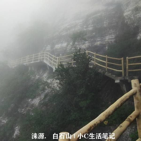 夏季爬山容易遇见阴雨天气 尽管没有了晴空万里的艳丽 但是水墨云游的感觉也不错 而且非常友好的气温可以缓解攀爬中的艰辛全体游客索道上山之后,开启步行路线~白石山的游览步道有上线和下线两种选择: A.上线——景点更多,线路较短; B.下线以绝壁长廊和悬崖咖啡厅出名,长度是上线的一倍。 话说这些都是快下山才知道的~~~具体路线最后详细说明吧 目的地咖啡厅的我们,毫不犹豫选了下线的步行游览 在云雾缭绕中,绝壁长廊褪去了惊险 倒成了专注脚下的悠然步道