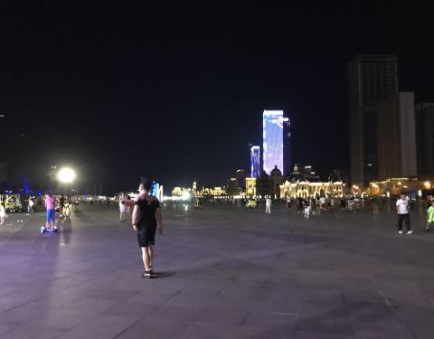 大连火车站北广场夜晚灯火通明,附近走过马路有小超市,自助餐厅,快餐店,肯德基比较方便。我们去了一家海鲜自助餐厅,品种花样繁多,还有烧烤,味道都不错