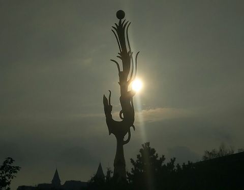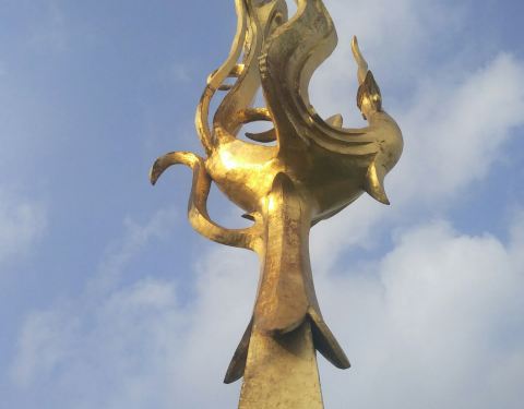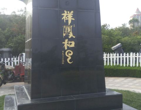 半圆广场位于黄岛金沙滩岸边上的一处小广场,半圆广场很普通,除了一处白色大伞亭后还有一尊金色凤凰雕塑像了:祥凤和云铭。这应该是金沙滩的标志吧。